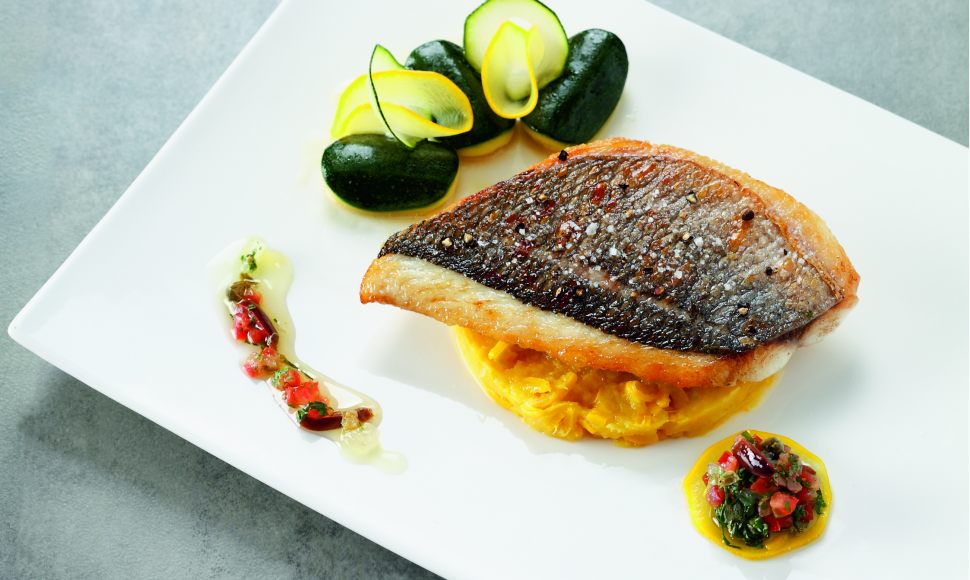 Filet de daurade, courgettes cuites et crues, sauce vierge