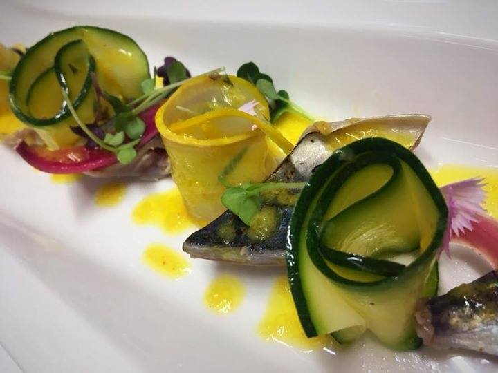 Disposez dans une assiette vos courgettes , le poisson, les pickles d'oignon et versez de la vinaigrette émulsionnée.