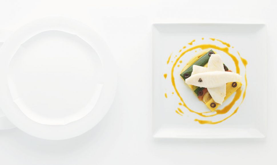 Filet de saint-pierre à la broche, tian de légumes glacés, sucs au thym citron
