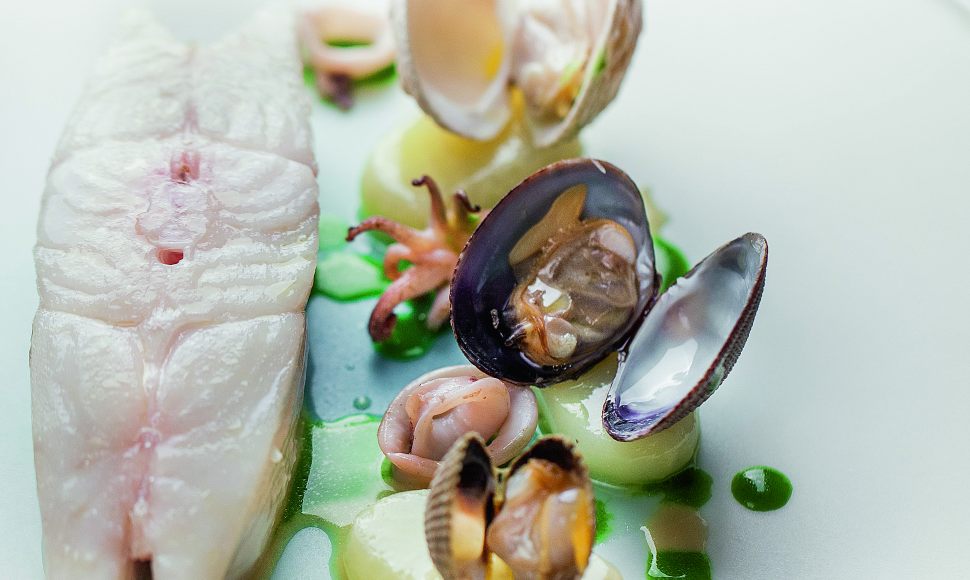 Filet de Saint-Pierre au plat, coquillages et supions, jus au vert