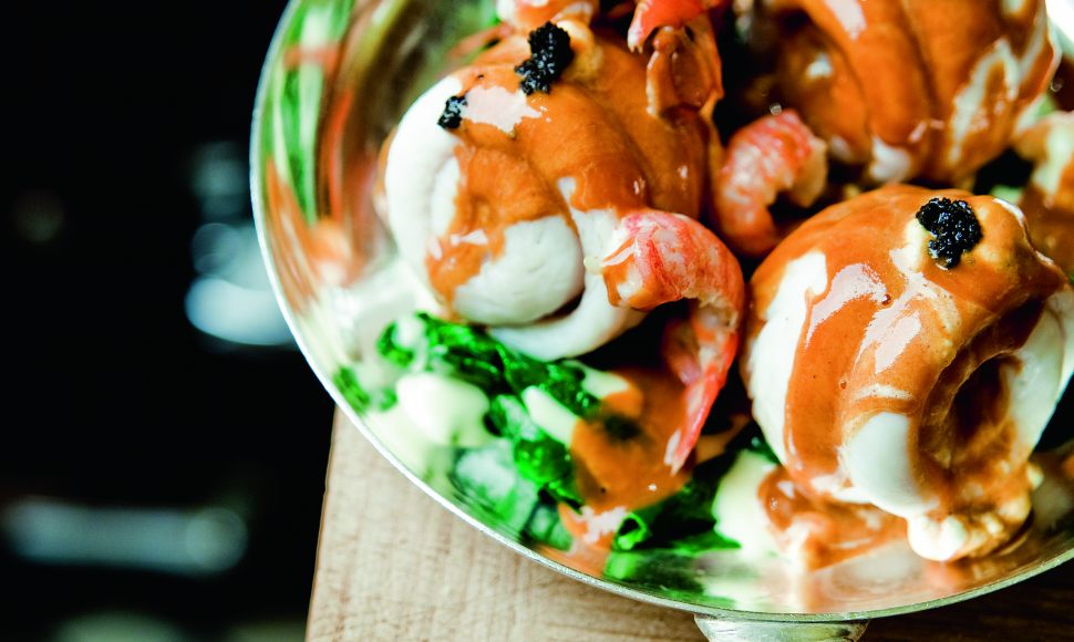 Rincez les écrevisses à l’eau froide. Châtrez-les : enlevez leur boyau noir en pinçant délicatement la nageoire centrale de la queue de l’écrevisse, puis séparez les têtes des queues. Disposez-les séparément dans deux passoires afin qu’elles puissent s’égoutter. Taillez l’échalote en rondelles de 3 mm sans retirer la peau, claquez la gousse d’ail et écrasez la branche d’estragon entre vos mains. Faites chauffer une cocotte avec l’huile d’olive à feu vif, puis saisissez les queues jusqu’à ce qu’elles soient bien rouges. Baissez le feu, ajoutez le beurre demi-sel, le thym, l’ail, l’échalote, l’estragon et les grains de poivre. Déglacez avec le cognac et le vin blanc, puis couvrez la cocotte d’un linge humide. Laissez tiédir quelques minutes à température ambiante. Décortiquez les queues encore tièdes et réservez-les.