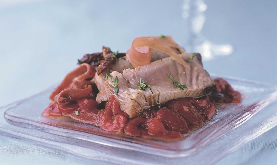 Un filet de thon aux herbes à la biscayenne accompagné de de tranches de jambon cru.