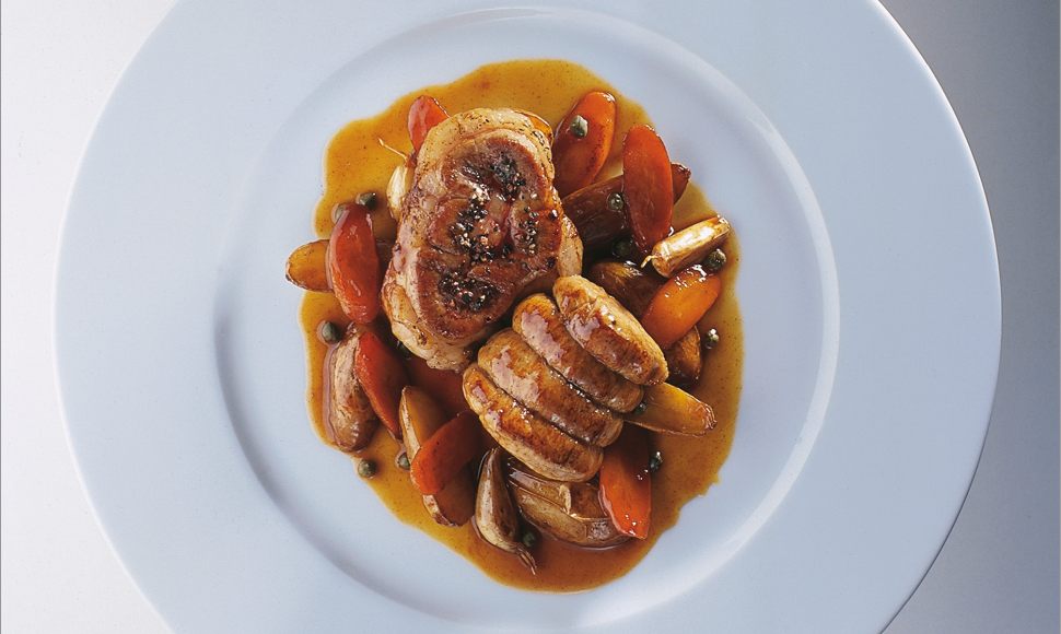 Filet mignon de veau de lait rôti et rognon tranché épais, pommes grenailles, carottes et petites câpres