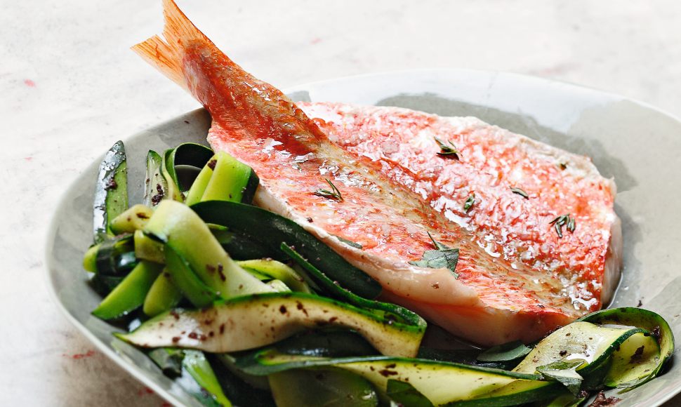 Le rouget est un poisson à la chair délicate. Dans cette recette rapide à cuisiner, il est mis à l'honneur. Simplement cuit sous le grill du four avec une pointe de thym, il est accompagné de courgettes légèrement croquantes et parfumées à la tapenade.