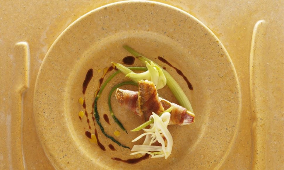 Dans la poitrine de porc, tailler seize tranches de 1 mm d’épaisseur. Envelopper les filets de rougets et les rougets reconstitués de deux tranches chacun.
