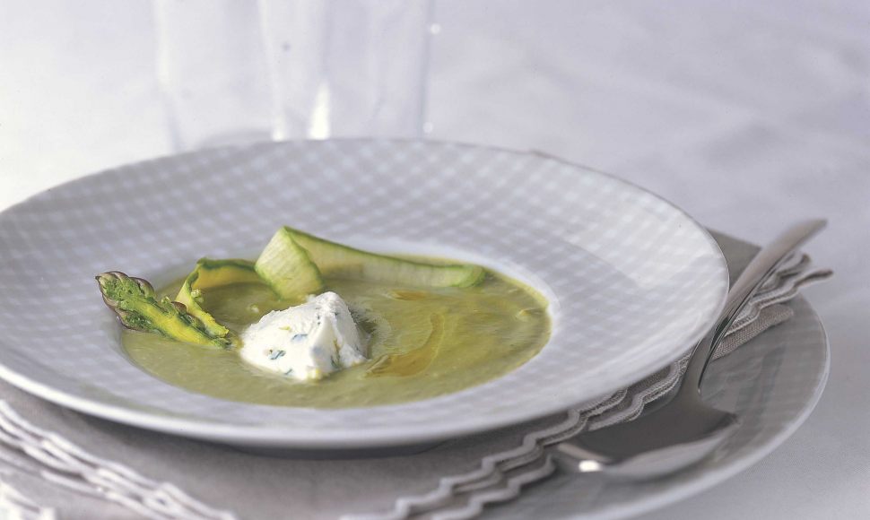 Une crème d'asperges accompagnée d'une garniture au chèvre frais, asperges et ciboulette.