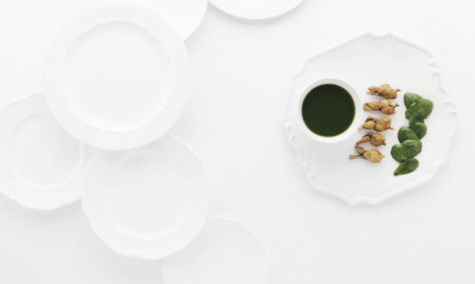 Le cresson, plante herbacée au léger goût piquant, se cuisine généralement en velouté et bouillon. Ici, en fine crème, obtenue grâce à un mélange de cresson, fond de volaille et crème liquide, elle s'accompagne d'un mets typiquement français, les cuisses de grenouilles blondies au thym et à l'ail.