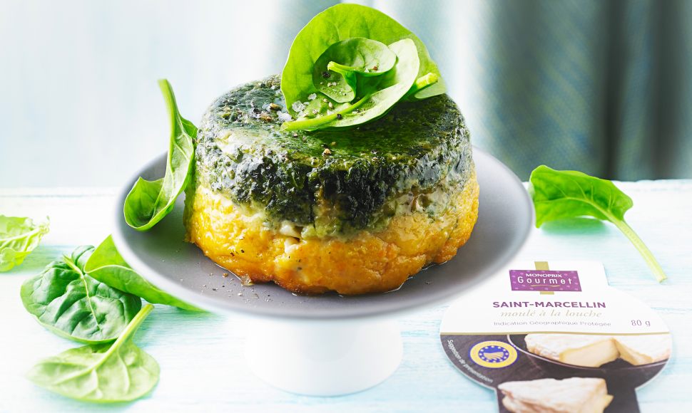 Couper le fromage Saint-Marcellin en petits morceaux. Dans un saladier, mélanger les œufs, la crème, la maïzena, le sel et le poivre. Diviser cette préparation en deux parties dans deux saladiers. Verser dans le premier saladier la purée de patate douce et dans l’autre la purée d’épinards. Beurrer des ramequins. Verser en premier le mélange de patate douce puis le mélange d’épinards. Faire cuire pendant 20 minutes.