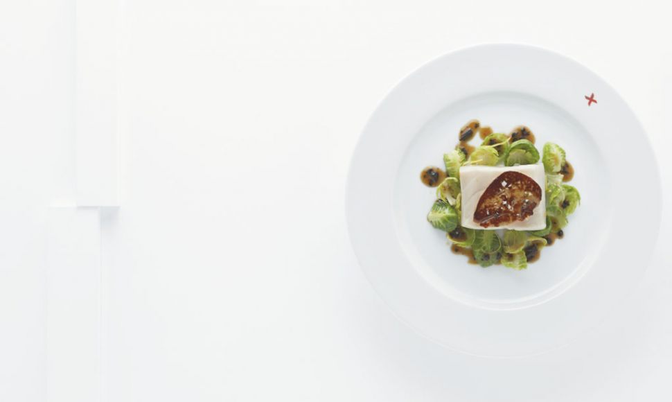 Flétan braisé, foie gras grillé choux de Bruxelles, vinaigrette à la truffe noire