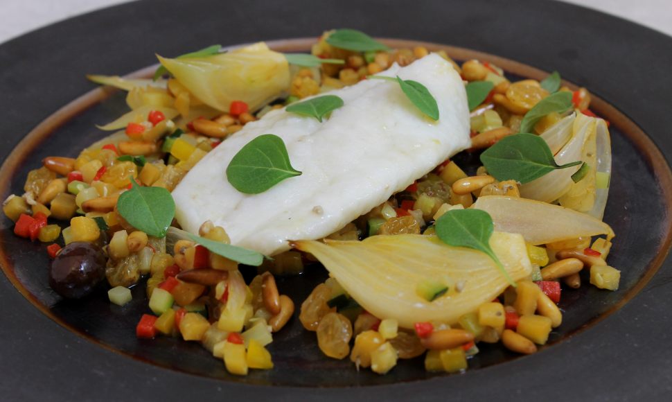 La caponatina est la cousine sicilienne de notre ratatouille niçoise. Comme elle, elle peut se déguster chaude ou froide. Nous l’avons accompagnée de turbot, un poisson de choix à la chair délicate et raffinée, parfaite pour un déjeuné estival. Mais cette recette peut se faire avec n’importe quel filet de poisson.