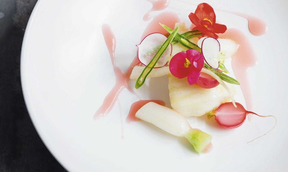 Flétan, vinaigrette de radis, haricots et fleurs de bégonia