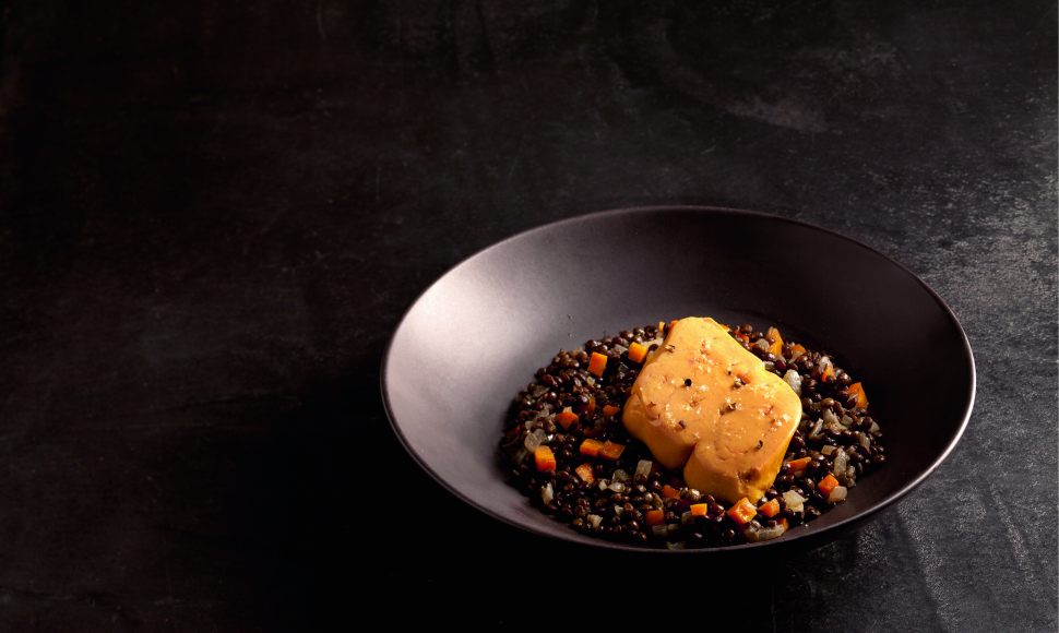 Avec cette recette, Alain Ducasse vous propose une façon originale de servir le foie gras. Faites cuire les lentilles vertes dans un bouillon de légumes avec l’oignon émincé, la brunoise de carottes et un bouquet garni. Placez les tranches de foie gras en papillotes dans le panier vapeur d’un faitout puis, une fois cuites, déposez-les sur les lentilles préalablement réparties dans des assiettes creuses.