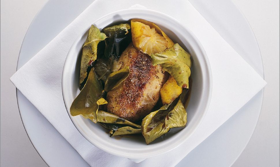 Assaisonner le foie gras de sel fin, puis démarrer la cuisson à froid dans une poêle en fonte, le glisser au four à 200 °C et le colorer sur toutes ses faces. Finir la cuisson dans une cocotte en Pyrex : l’envelopper de feuilles de citronnier en y glissant les écorces réservées de la marmelade, badigeonner les feuilles de graisse de canard, refermer la cocotte et cuire dans un four très chaud à 220 °C durant 7 minutes.