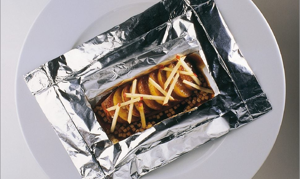 Foie gras de canard des landes cuit en papillote, pommes à jus –pommes d’api