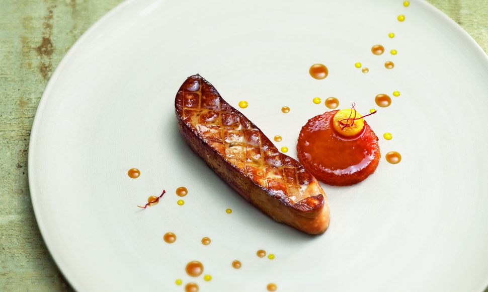 Foie gras de canard des Landes poêlé, coings fondants au parfum de safran, jus de canard