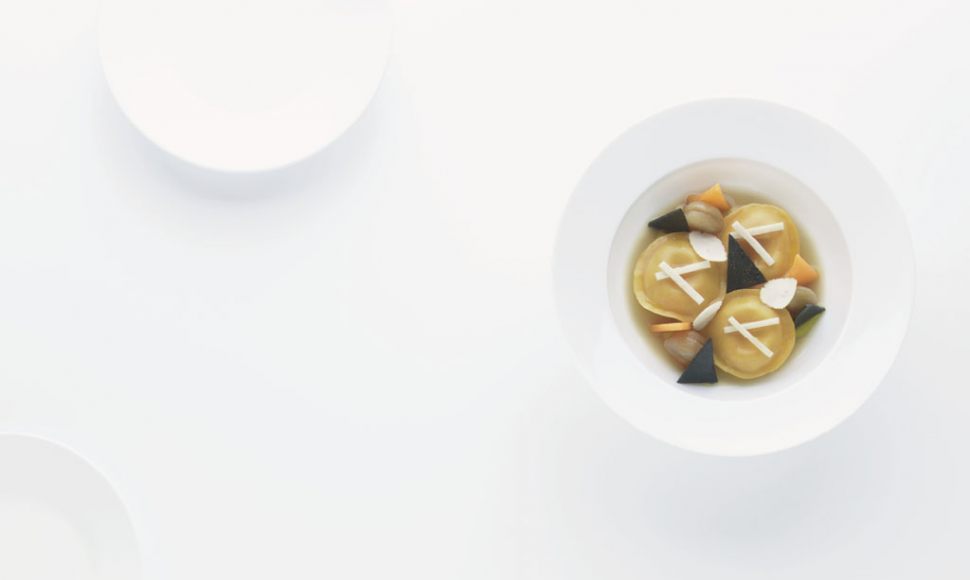 Foie gras de canard en consommé, potiron, châtaignes, truffe noire
