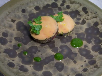 Après complet refroidissement du foie gras, ôter le film autour et le tailler en 8 escalopes régulières. Dresser deux escalopes de foie gras légèrement chevauchées au centre des assiettes, ajouter une pincée de fleur de sel sur chacune. Disposer les sommités d’herbes réservées par-dessus et saucer de quelques points de condiment à l’aide d’une cuillère à café autour des escalopes de foie gras. Servir le restant du condiment à part dans un récipient.