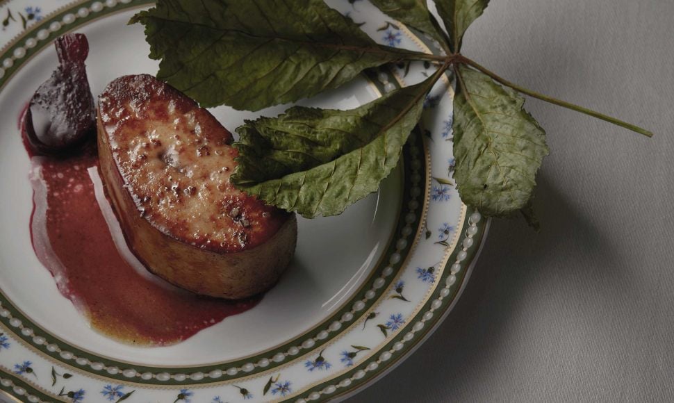 Taillez 4 grosses escalopes de foie gras de 100 g chacune et salez-les avec de la fleur de sel. Poêlez-les dans une poêle chaude quelques secondes de chaque côté, puis assaisonnez-les de sel, de poivre et de genièvre. Rafraîchissez-les immédiatement dans un récipient posé sur des glaçons.