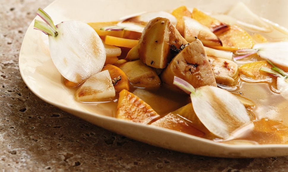 Une fois poché le foie gras change de texture en devenant beaucoup plus onctueux et fondant sans pour autant perdre de sa saveur. Accompagné de navets croquants et de son bouillon il ne manquera pas de vous régaler.