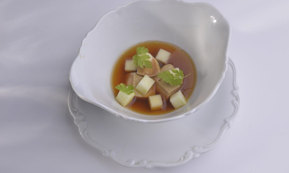 Répartissez les morceaux de foie et de pomme dans deux ramequins (ou deux jolis bols) individuels. Filtrez le bouillon et versez-la bouillant dessus.