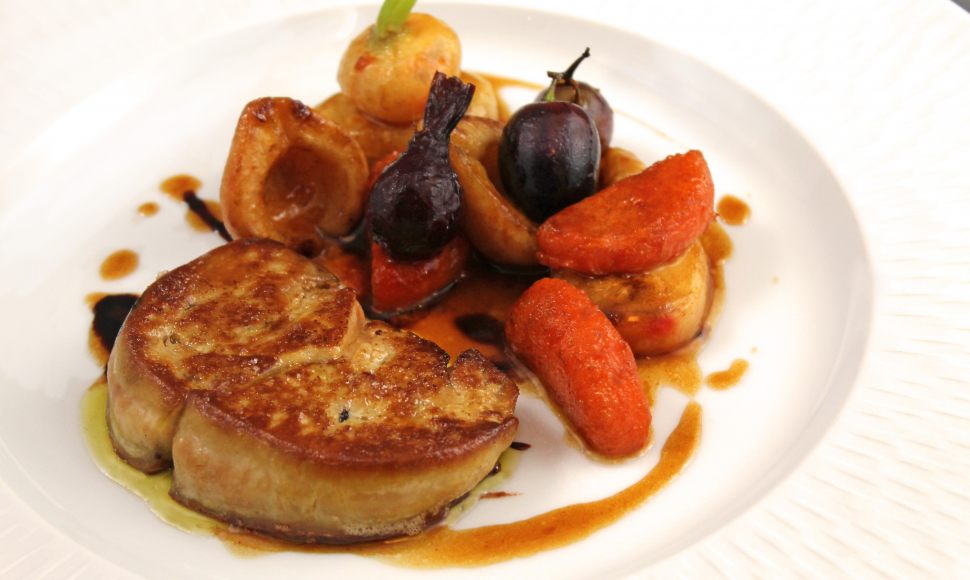 Foie gras poêlé, légumes et fruits d’hiver au porto