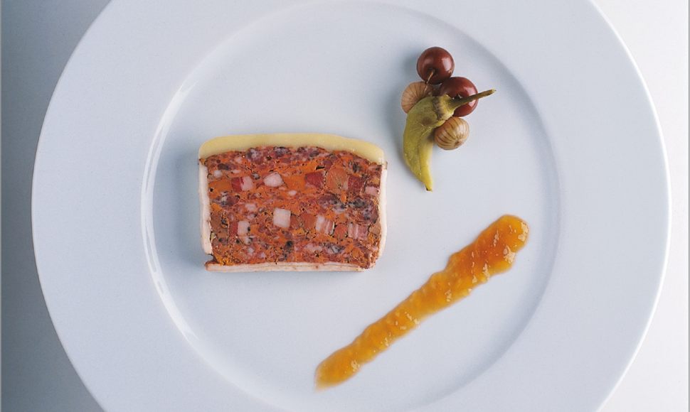 Tailler la poitrine au poivre en lanières de 10 cm de long sur 5 mm de large, puis la faire mariner dans le mélange d’alcools avec le quatre-épices et la fleur de thym pendant également 2 heures.