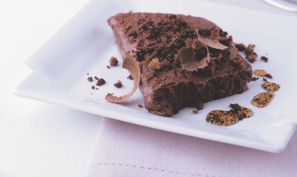 Un fondant au chocolat et steusel au thé earl grey, sirop de thé et copeaux de chocolat.