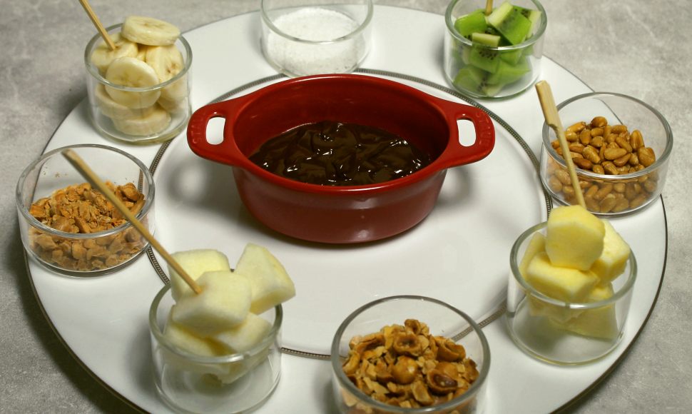 Dessert convivial par excellence, la fondue au chocolat régalera vos invités toute l’année. Si la sauce chocolat est la même, les fruits vont varier selon les saisons. En été, vous la réaliserez de même avec des fraises, des cerises dénoyautées, des pêches et des abricots coupés en morceaux.