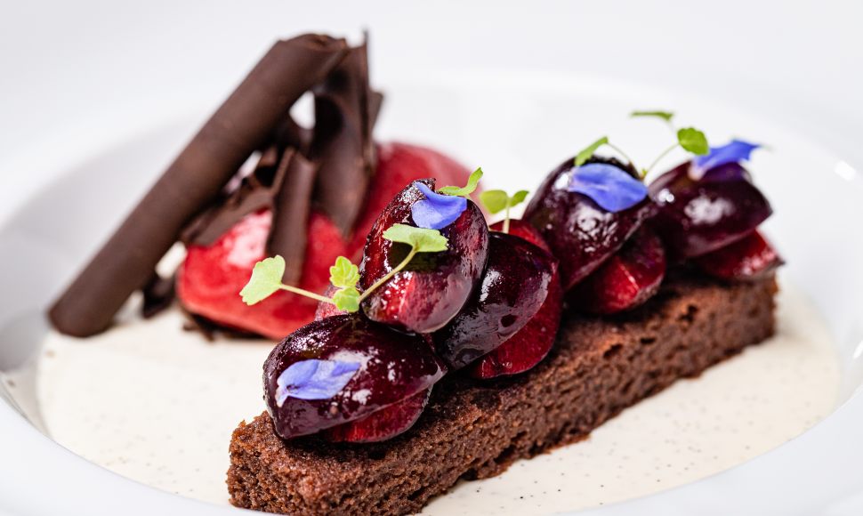 Une réinterprétation de la Forêt Noire : un biscuit chocolat cuit vapeur, une crème au kirsch vanillée, des cerises marinées à la vanille et a la pulpe de cerise noire, un sorbet à la griotte et un sirop d'imbibage au kirsch. Un dressage tout en finesse : quelques cerises posées sur le dessus, des copeaux de chocolat et des fleurs de bourrache. Un hommage aux habitants de Laubach, dit les "picoreurs de cerise".