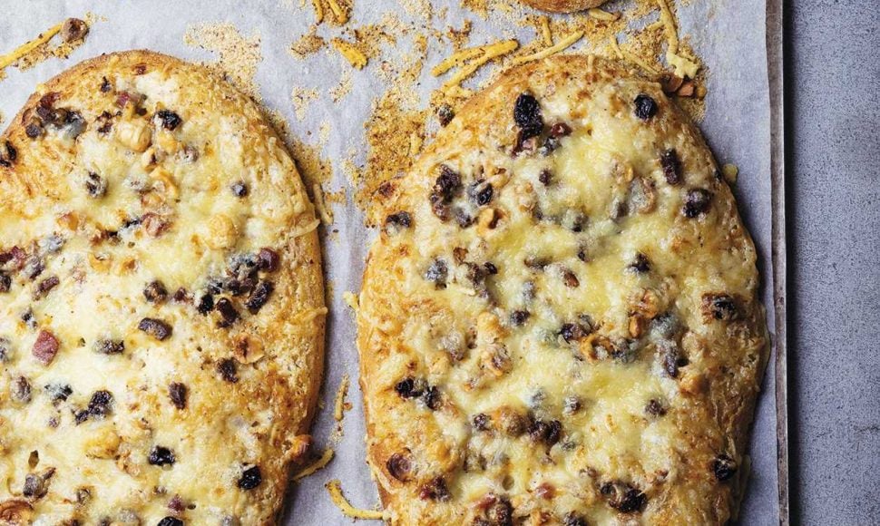 Étalez la crème d’ail sur les pâtons, jusqu’à 1 cm du bord. Taillez le magret et le fromage de brebis en brunoise. Concassez les noisettes et les raisins secs. Disposez la garniture sur la crème d’ail. Enfournez les 2 fougasses et laissez cuire pendant 11 min.