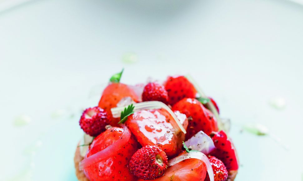 Mettez 150 g de sucre et les fraises dans un saladier bien filmé et faites cuire au bain-marie, dans une casserole remplie d’eau, pendant environ 2 h, puis passez au chinois. Faites chauffer le jus et incorporez le sucre mélangé à la pectine NH, portez à ébullition, puis réservez au frais.