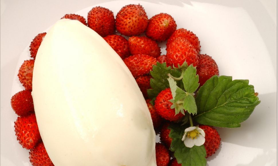 Fraises des bois dans leur jus tiède, sorbet au fromage blanc