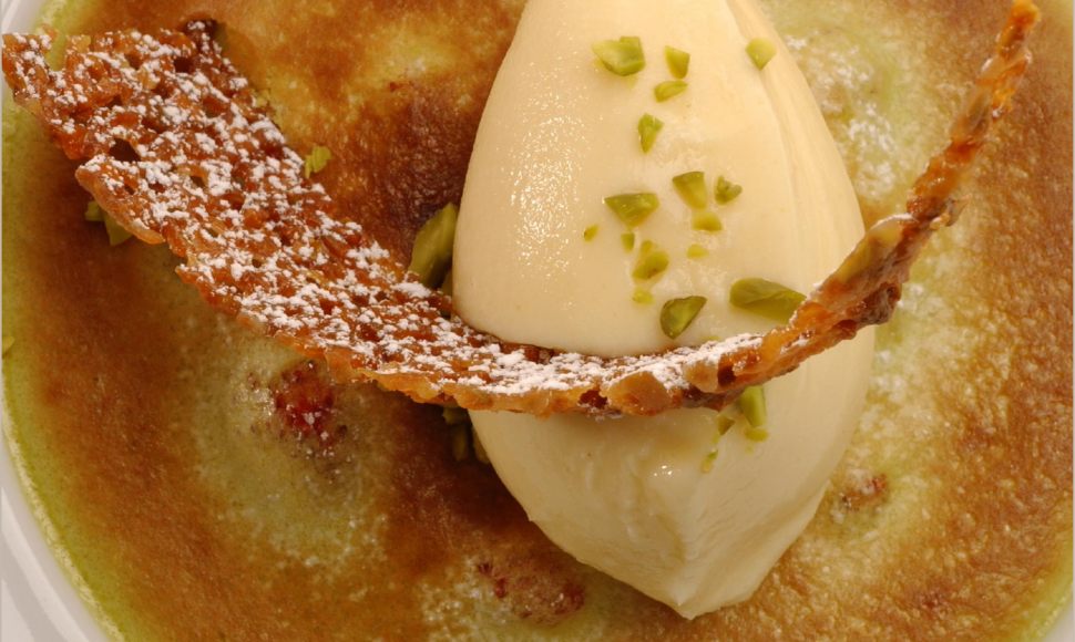 Mélanger le lait et le sucre. Incorporer la farine tamisée, puis les pistaches concassées et enfin le beurre fondu. Réserver 2 heures au frais, étaler le mélange sur une plaque antiadhésive. Faire cuire au four à 180 °C jusqu’à ce que les tuiles soient dorées et croquantes. Les détailler à la dimension voulue et les réserver au sec.