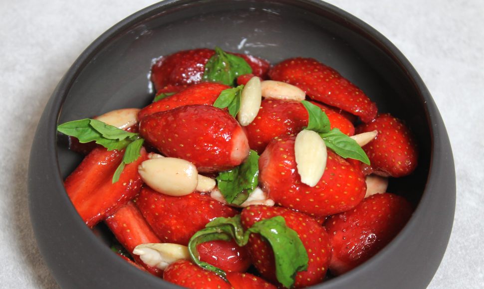 Vous avez de jolies fraises au frais et vous souhaitez faire un dessert gourmand et rapide ? C'est simple, cette recette est tout juste parfaite faite pour vous. Sublimez vos fraises avec un peu de miel de lavande, du basilic et des amandes pour un résultat des plus savoureux.