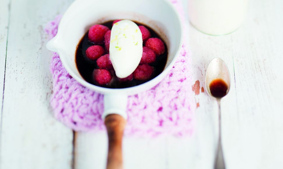 Dans une casserole, faites bouillir l’eau et le sucre semoule pendant 2 min, puis laissez refroidir. Hors du feu, ajoutez 4 c. à s. de vinaigre balsamique.