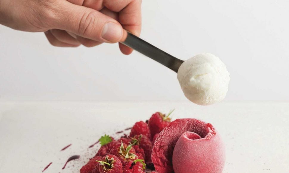 Dans une casserole, réalisez un sirop avec l’eau et le sucre, puis laissez refroidir. Ajoutez la purée de framboise et le jus de citron, et mélangez. Laissez mâturer pendant 12 h.