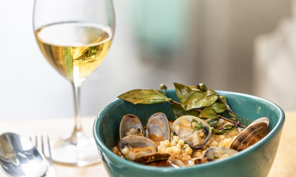 Les fregola, ces pâtes sardes par excellence et qui ressemblent à des grains de couscous surdimensionnés, apparaissant comme un plat du dimanche, gratifiées de belles palourdes de saison.