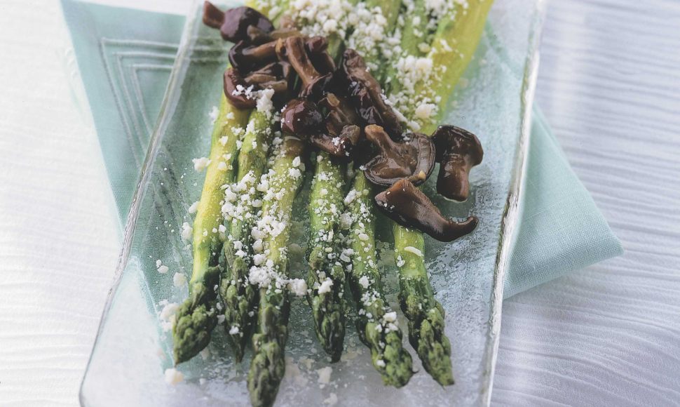 Des asperges vertes et champignons en fricassée, saupoudrés de parmesan.