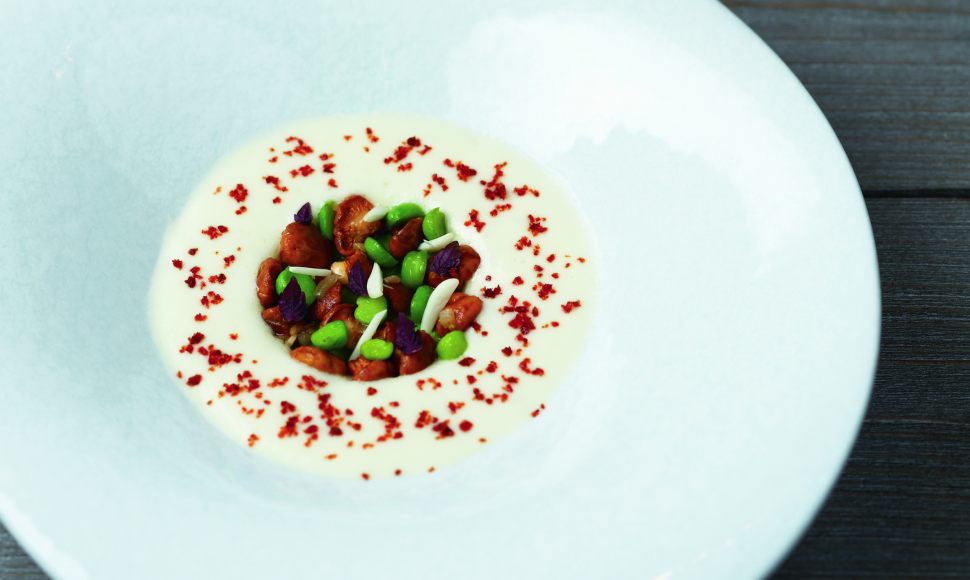 Fricassée de girolles et petits pois au vin jaune, crème d'oignons