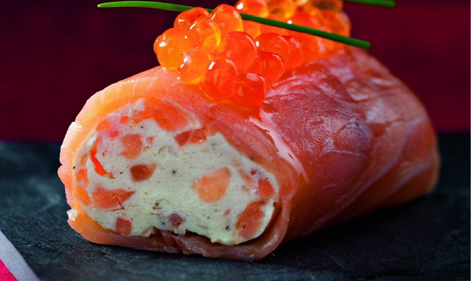 Au moment de servir, ôtez le film des roulés de saumon puis coupez en biseau les deux extrémités. Déposez les roulés sur chaque assiette puis posez dessus les œufs de saumon. Décorez d’herbes et accompagnez de la crème et de quelques quartiers de citron.