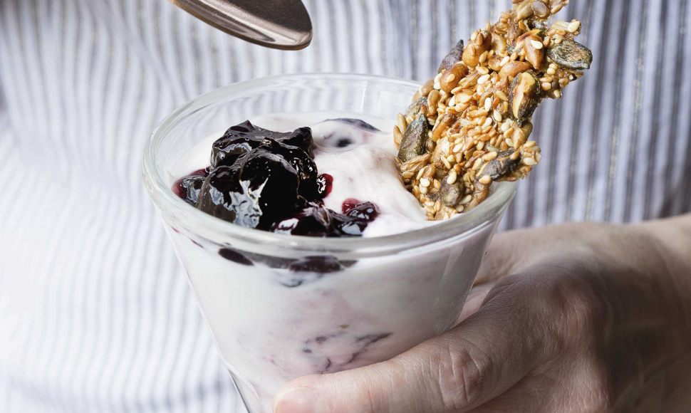 Du fromage blanc et confiture avec une tuile de fruits secs : pistaches, amandes, graines de courge.