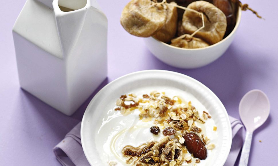 Pour un petit déjeuner dynamique, déposez sur chaque fromage blanc 1 c. à s. de muesli, 1 figue coupée en fines tranches et 1 datte dénoyautée et coupée en petits morceaux. Sucrez à votre convenance.