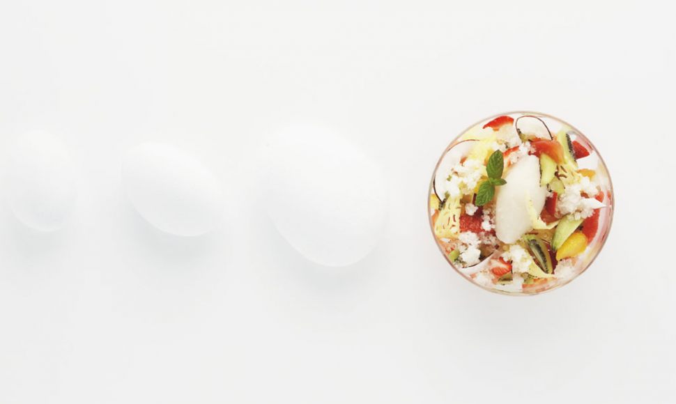 Fruits crus et cuits au basilic, sorbet litchi et granité de citronnelle/menthe