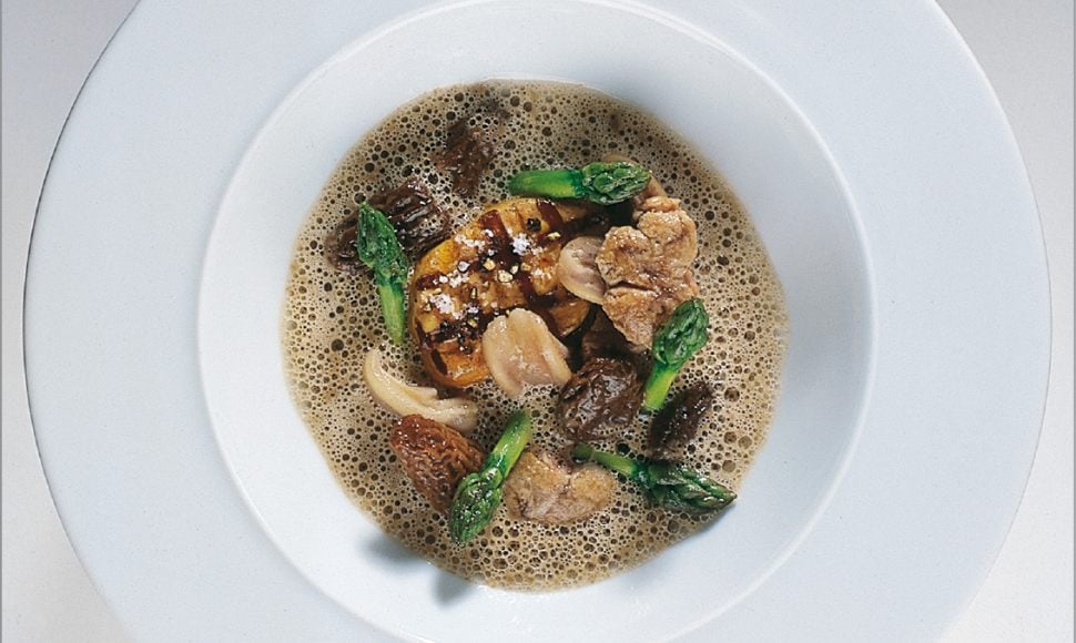 Fumet de morilles, asperges vivement sautées, abattis de canard mijotés