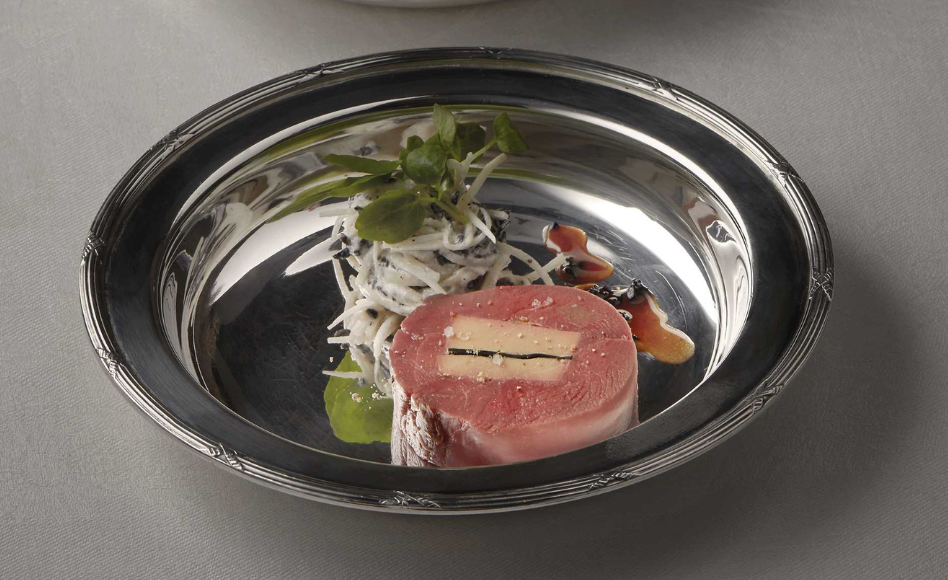 Cette galantine de palombe est un hommage à la finesse et à l’élégance de la cuisine traditionnelle. La palombe, soigneusement désossée, se mêle à une farce parfumée et subtile, enveloppée dans une gelée délicate qui fond en bouche.