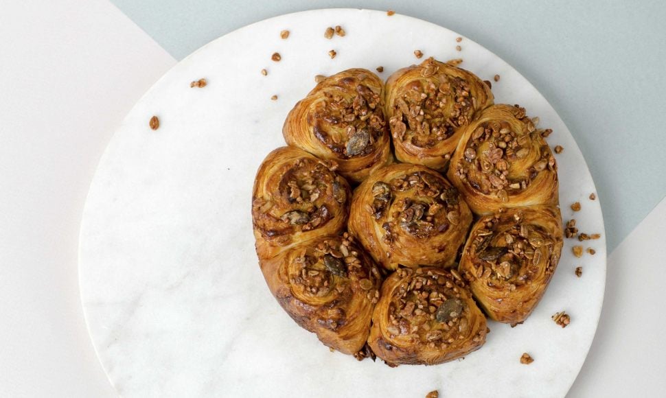 Une galette des rois revisitée, garnie d'un praliné céréales-graines et d'une crème pâtissière, le tout dans une pâte à croissant en lieu et place de la pâte feuilletée.