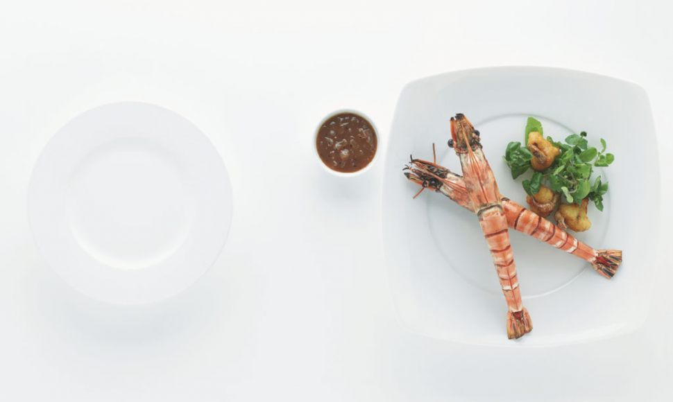 Gambas jumbo rôties « tellicherry », vinaigrette tamarin, cresson et acras de crevettes