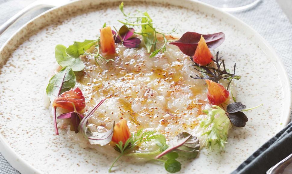 Des gambas crues accompagnées d'une huile de gingembre et d'orange sanguine.