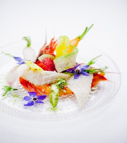 Gamberoni sautés, calamars, seiches, légumes croquants et bourrache