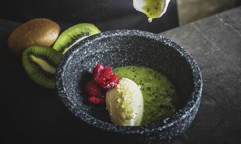 Gaspacho de kiwi de l’Adour, crémeux au chocolat blanc et framboises